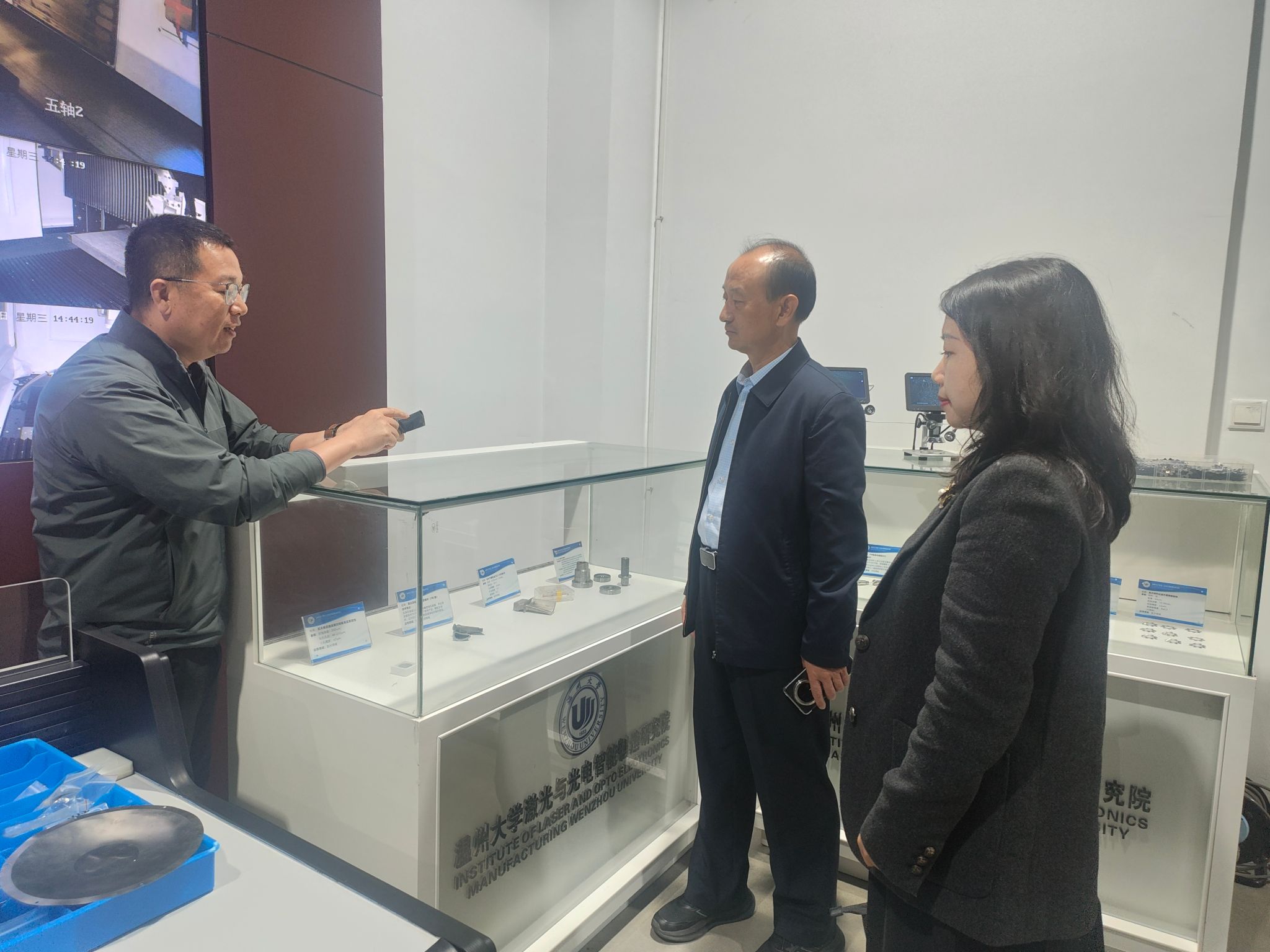 石坚伟书记一行参观了我院检验检测中心、超快激光加工中心及中试平台等,林礼区副院长详细介绍了研究院的发展历程、科研平台建设及成果转化情况。研究院作为浙江省内首批新型研发机构,实行"人才+技术+服务+资本"四位一体科技成果产业化模式,在超快激光精密制造、激光加工制造、智能装备研发等领域形成了技术优势。